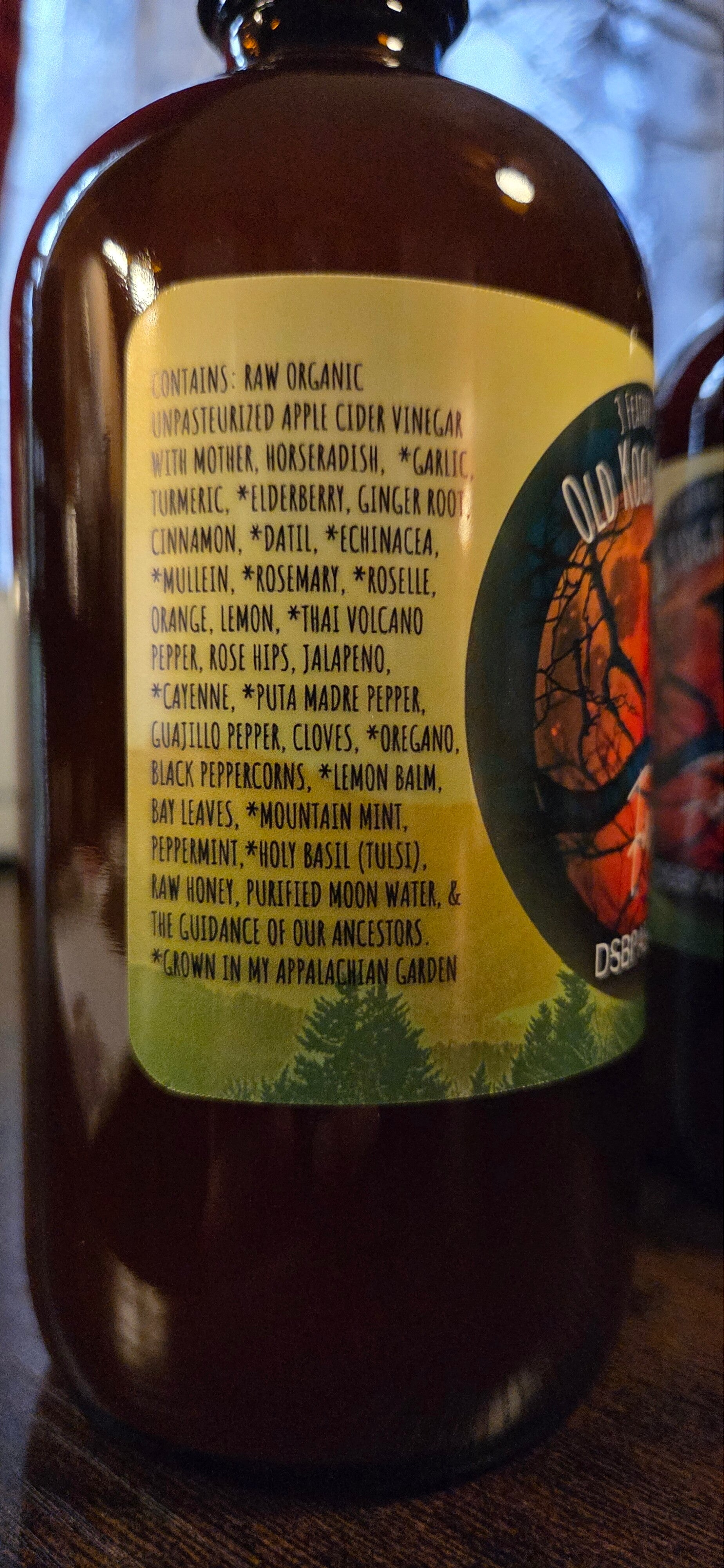 Contains: Raw Organic Unpasteurized Apple Cider Vinegar with Mother, Horseradish, *Garlic, Turmeric, *Elderberry, Ginger Root, Cinnamon, *Datil, *Echinacea, *Mullein, *Rosemary, *Roselle, Orange, Lemon, *Thai Volcano Pepper, Rose Hips, Jalapeno, *Cayenne, *Puta Madre Pepper, Guajillo Pepper, Cloves, *Oregano, Black Peppercorns, *Lemon Balm, Bay Leaves, *Mountain Mint, Peppermint,*Holy Basil (Tulsi), Raw honey, Purified Moon Water, & the guidance of our ancestors.